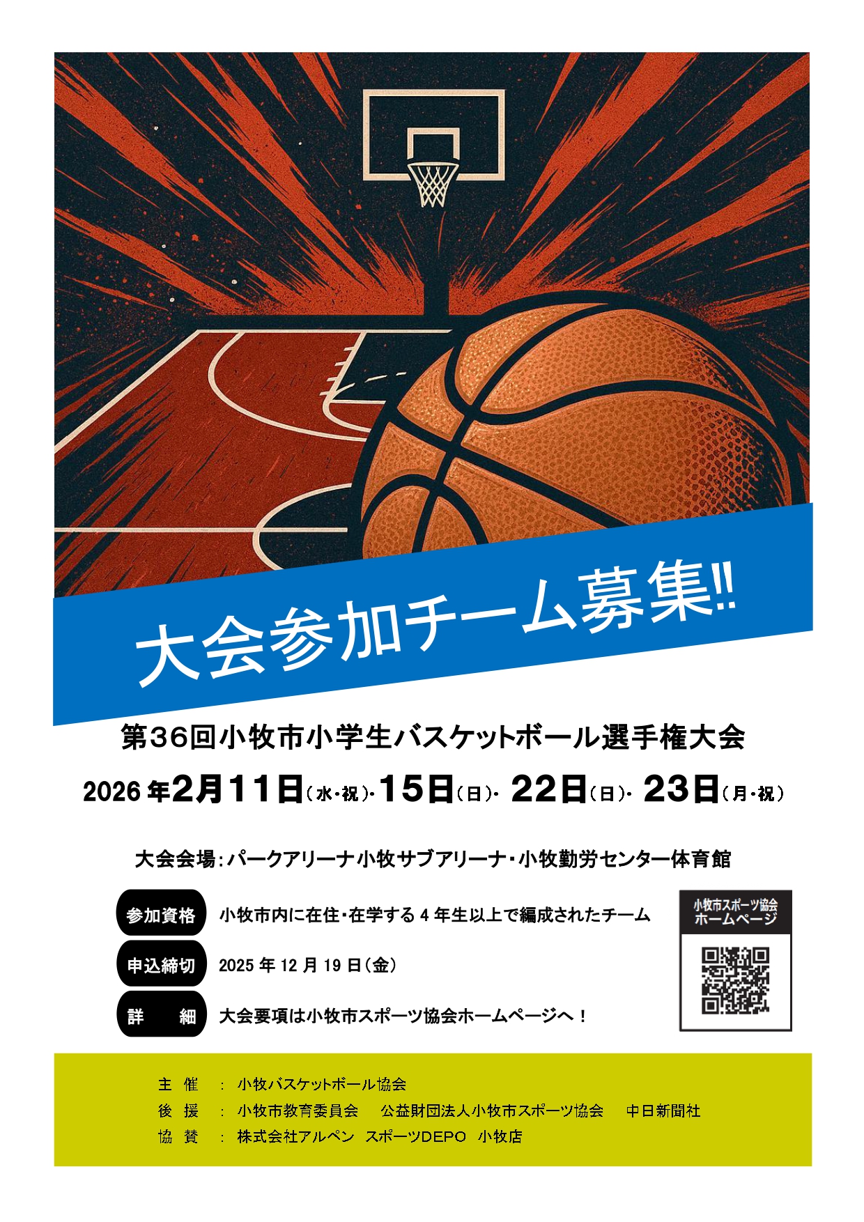 2026年2月11日(水・祝)からパークアリーナ小牧サブアリーナ他で 『第36回小牧市小学生バスケットボール選手権大会』が開催されます。 日頃の練習の成果を発揮するため、是非ご参加ください!